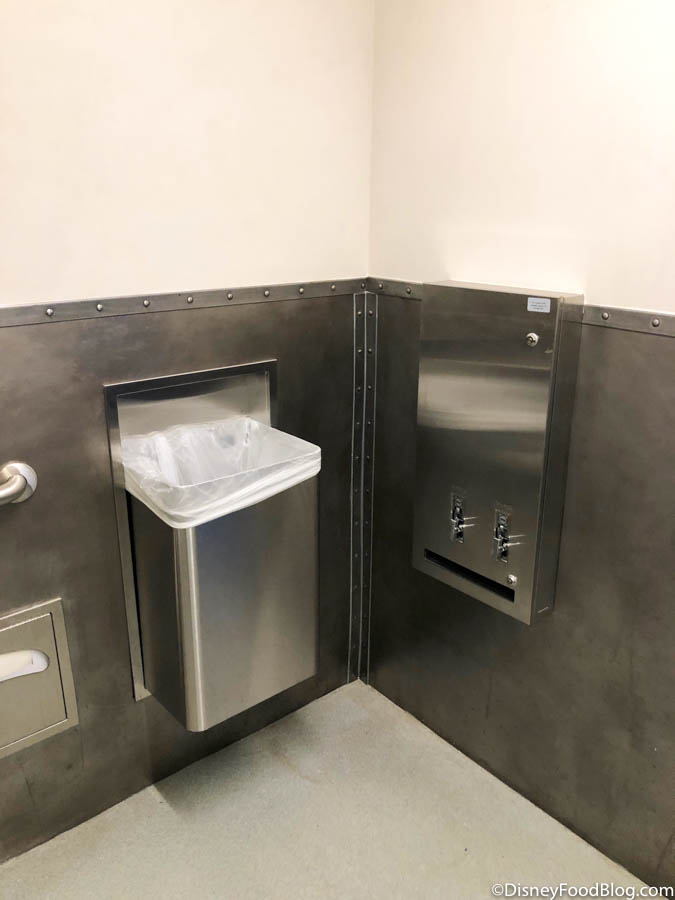 …and there’s a feminine hygiene product dispenser along a trash can receptacle in the corner. No changing table here, because you can’t soar on the back of a banshee with you bb! Gotta heed that height requirement!