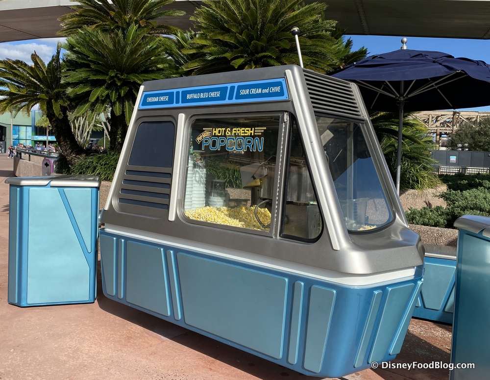 And while the Cheddar Cheese, Buffalo Bleu Cheese, and Sour Cream and Chive flavors had been available at the Epcot Experience since the cart mysteriously closed, it was SO NICE to see the cart back in action today — and all the tasty popcorns back in their little compartments!