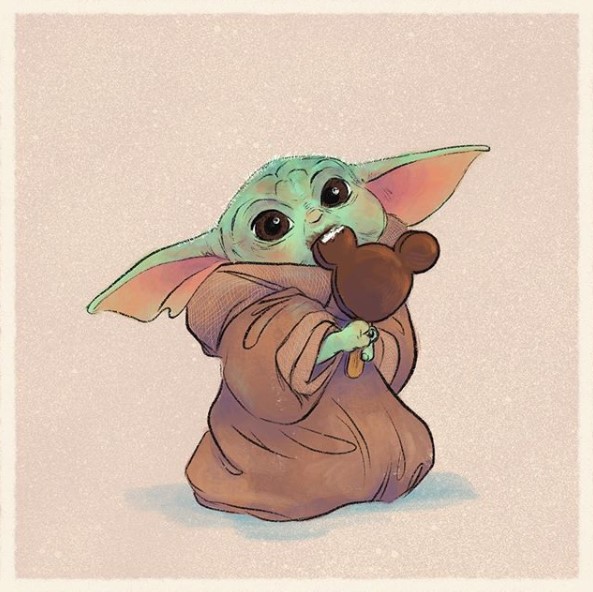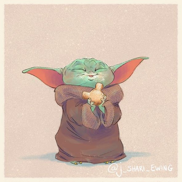 She’s created over a dozen drawings that feature Baby Yoda and you can see ALL of them at her Instagram, @j_shari_ewing. Our favorite you ask? It’s the Baby Yoda Eats Mickey Beignets one! Look how much powdered sugar he has all over him! How’s he going to get that off with his little hands? We’ve never heard of the force being used on powdered sugar but in this situation, we could get behind it.