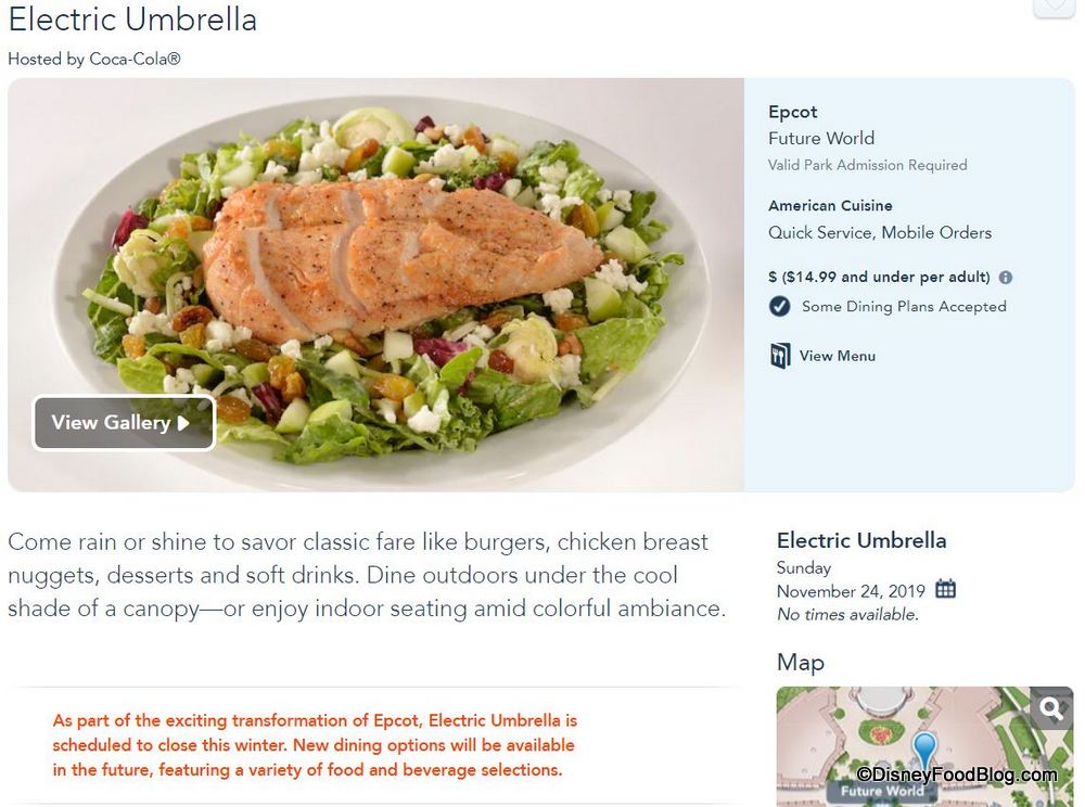 The Electric Umbrella’s website had led us to believe the fast-casual restaurant would be shutting down this winter as part of Epcot’s exciting transformation. You can see the forboding message below which appears in bright red lettering!