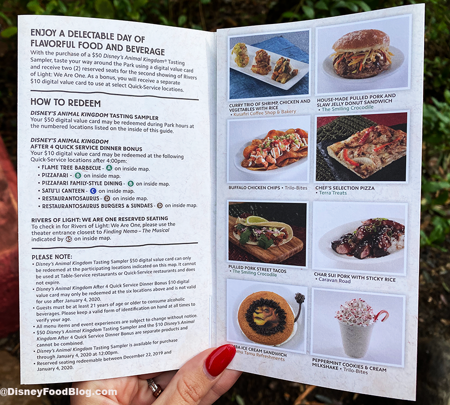 Here are the basics. The Tasting Sampler costs $50.00 and includes two digital value cards: One $50 card that can be used at over 40 outdoor food and beverage locations throughout the park (and does not expire), and a bonus $10.00 that can be used at the following quick-service restaurants after 4:00 PM from December 22, 2019 through January 4, 2020: Restaurantosaurus, Pizzafari, Flame Tree Barbecue, and Satu’li Canteen.