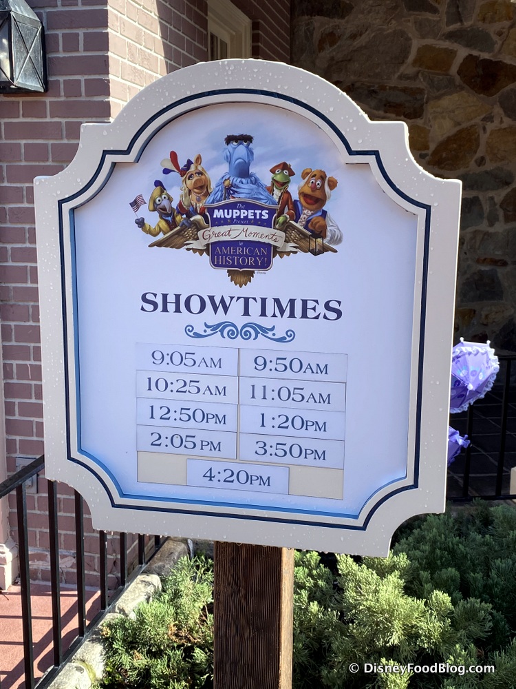 “The Muppets Present…Great Moments in American History” isn’t listed in the Magic Kingdom’s time schedule, but we can assure you it’s returned! Here are the times for the show that are currently posted in Liberty Square.