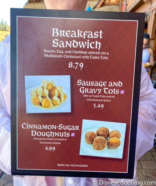 The Friar’s Nook is now serving up breakfast options for the holiday season through January 4th! Their breakfast is available 30 minutes after park opening through 11 AM (so you have plenty of time to hop on some rides and then grab food afterward!). The breakfast menu comes with three different offerings, a Breakfast Sandwich, Sausage and Gravy Tots, and Cinnamon-Sugar Doughnuts!