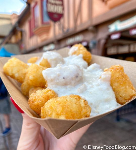 The Sausage and Gravy Tots are crispy tater tots covered in sausage gravy! The dish is available for $5.49 or a Disney Dining Snack Credit.