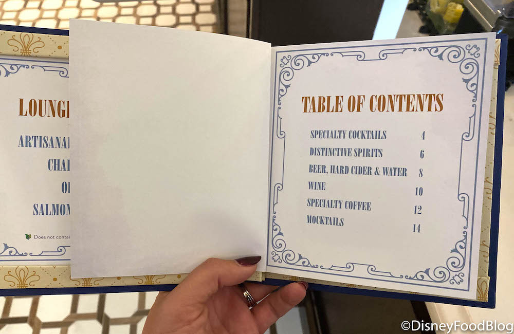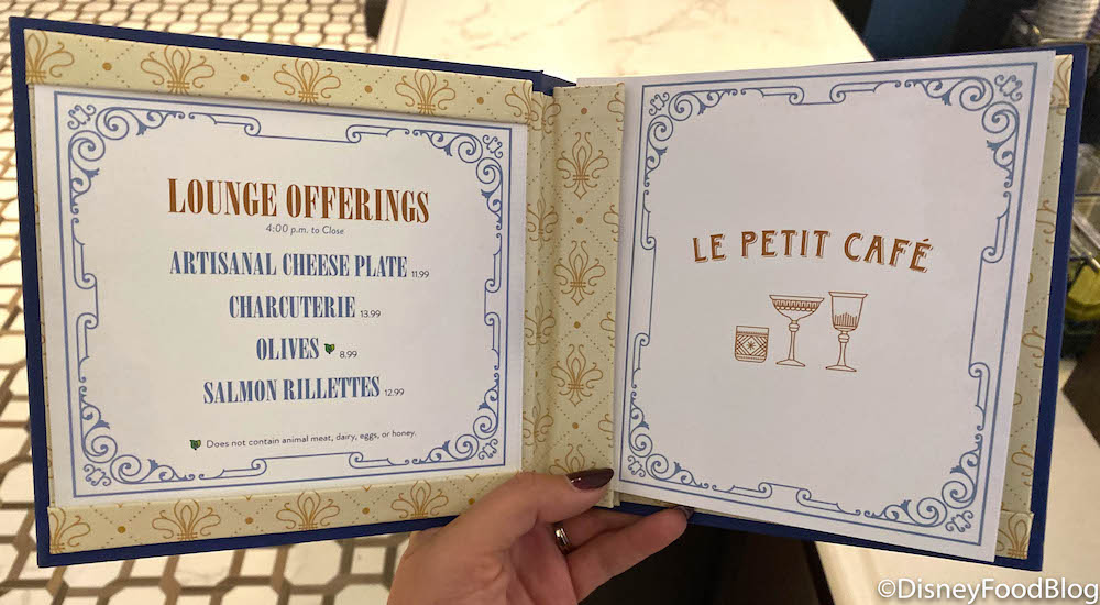 We love the design of both of these spaces, but the vintage Disney aesthetic and homages to Walt are enough to pull us right on over to the Voyageurs’ Lounge while we review the yummy evening menu from Le Petit Cafe.
