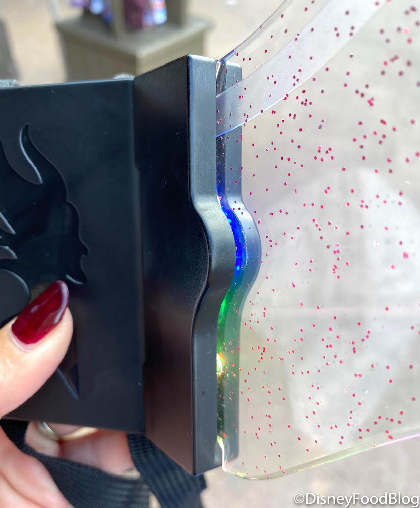 …the best part about the Maleficent Wings is the light-up feature and purple sparkles! Who doesn’t love some sparkly merchandise?? All you have to do is push the purple Maleficent silhouette on the strap…