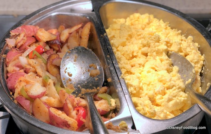For warm breakfast staples, breakfast potatoes are served with onions and peppers. Scrambled eggs are simple and plain.