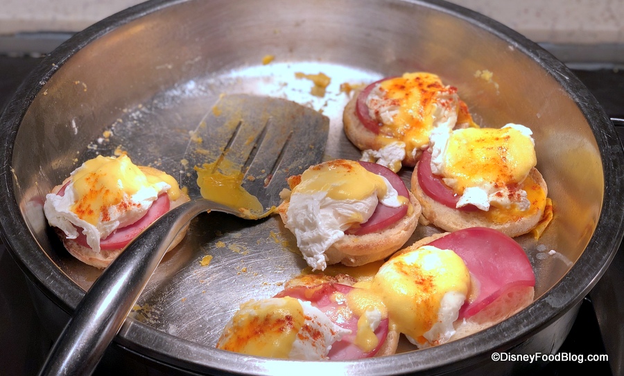 Eggs Benedict were in various stages of disarray, but the color of the hollandaise was vibrant, and the eggs were still runny (those that hadn’t been busted in the warmer).