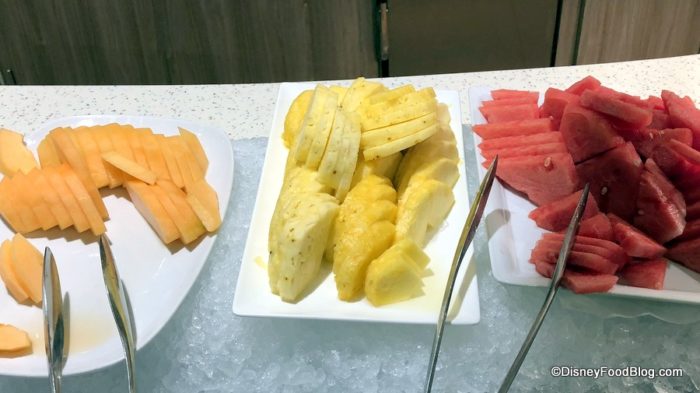 Fresh fruit included cantaloupe, pineapple, and watermelon.