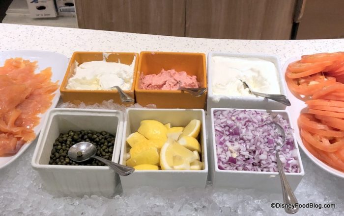 There’s a station for lox, capers, onions, and other related accompaniments.