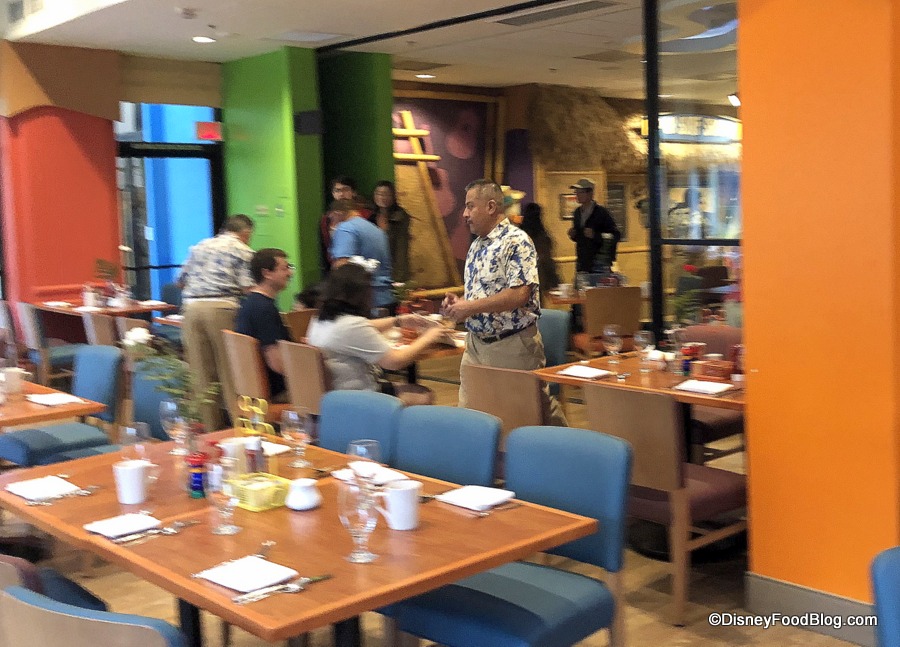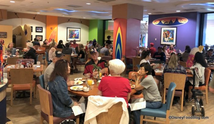 The dining room is colorful, with oblong, surfboard-shaped designs here and there. Seating is at tables with comfy padded chairs.