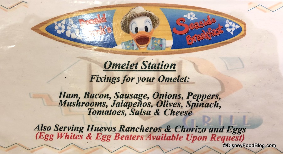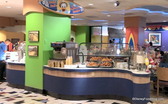 As you might’ve guessed, Donald Duck’s Seaside Breakfast features characters in their beach finest (you’ll see them in a bit!). We received this fun button when we checked in, which gives you a little sneak peek at how Donald hangs ten!