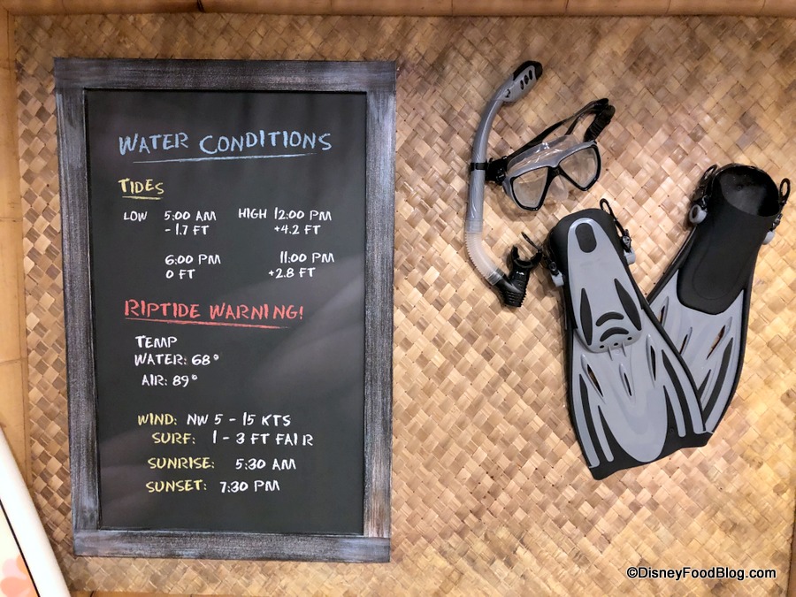 Check out the water conditions, and hang up our snorkel gear before you find your table. 😉