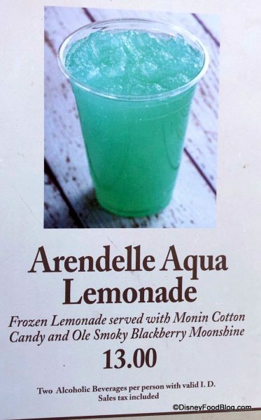- Arendelle Aqua Lemonade: Frozen Lemonade with Monin Cotton Candy and Ole Smoky Blackberry Moonshine – $13.00