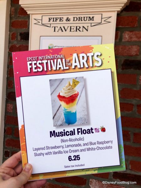 - Musical Float: Layered Strawberry, Lemonade and Blue Raspberry Slushy with Vanilla Ice Cream and White Chocolate (non-alcoholic) (KA) – $6.25