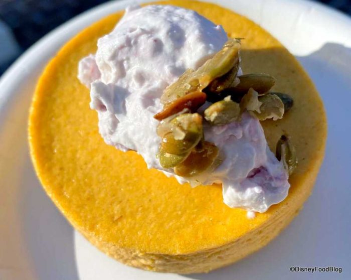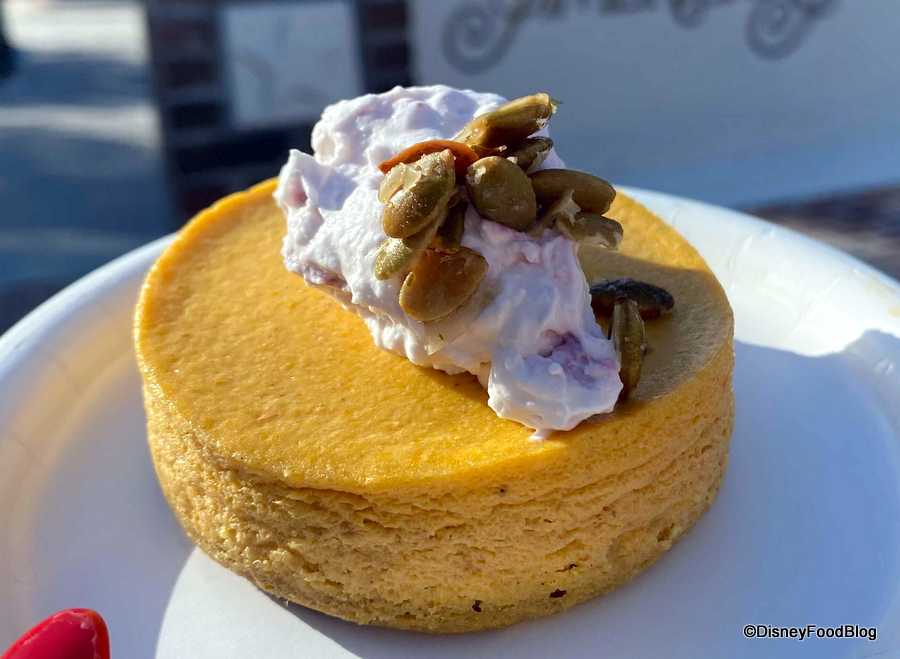 - Pumpkin Gingerbread Cheesecake with Cranberry Whipped Cream and Candied Pumpkin Seeds (New) — $4.25