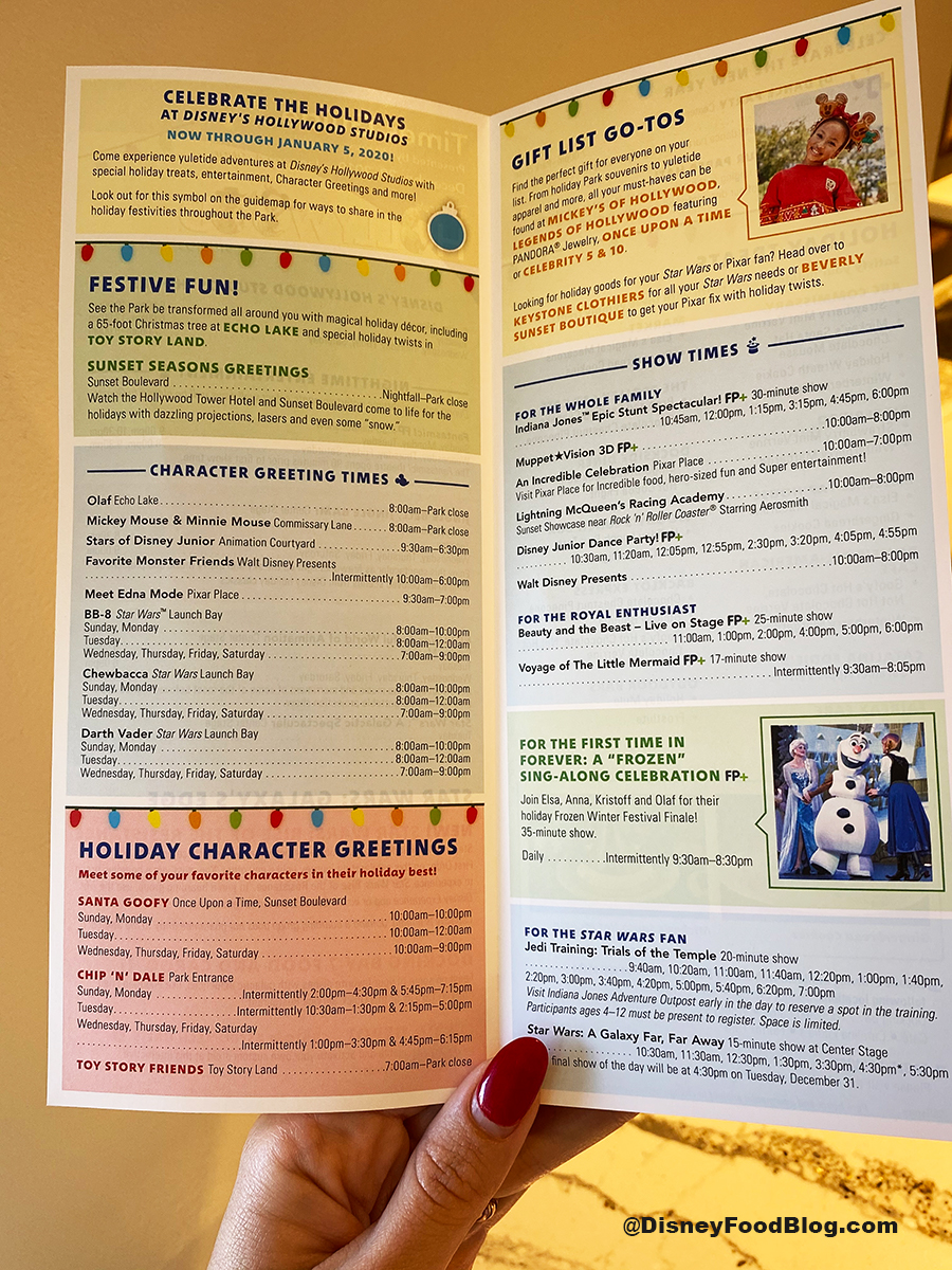 Let’s first check out the Hollywood Studios Times Guide. Here, they are doing one last push of the holiday treats that will be leaving menus come January 5, 2020. (How about one last Cinnamon-Apple Holiday Lunch Box Tart from Woody’s Lunch Box?)