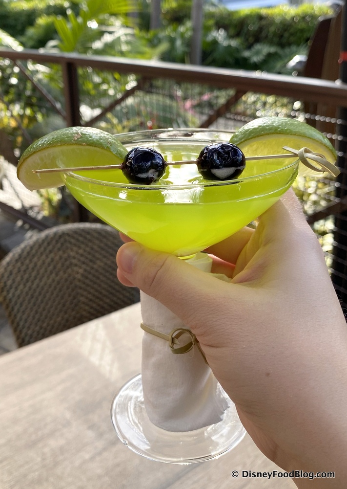 The green-colored drink comes with two edible cherry “eyes” on a skewer, two lime wedges for “ears,” and a little napkin tie at the bottom to represent Baby Yoda’s outfit.