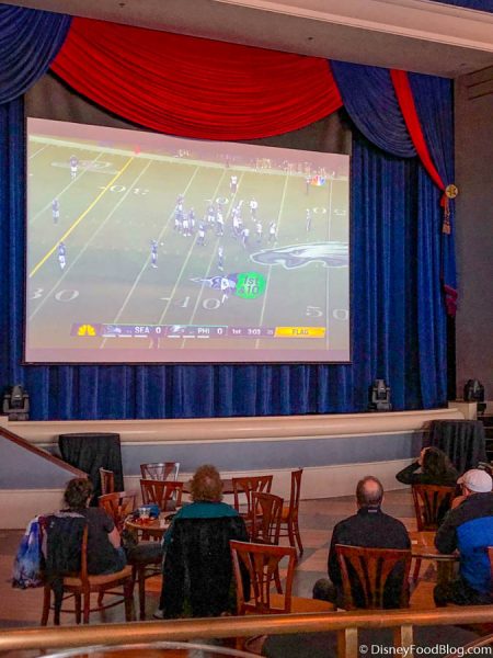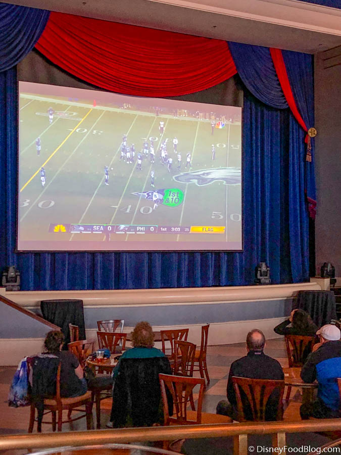 Of course, we had to step inside and sure enough, we found a bunch of people watching that Seahawks versus Eagles wildcard game on a big projector screen!