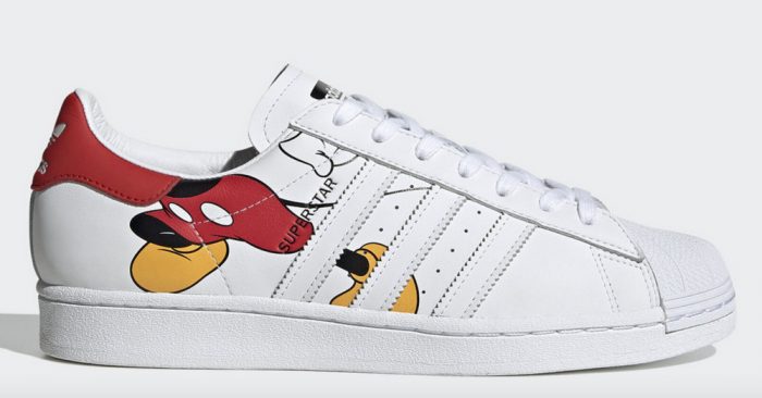 And these Mickey Mouse x Adidas Superstar shoes are also really special! They feature the classic red, yellow, and black color combo that reminds us of old-school Mickey! The graphic of Mickey Mouse in mid-stride on the side of the shoes is very visually-striking, too!