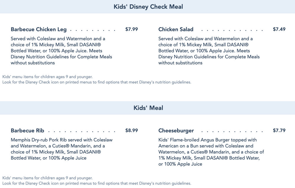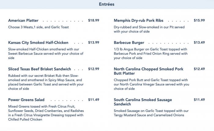 Check out the tasty American fare you’ll be feasting on at the new Epcot restaurant when it opens (which will hopefully be soon!) We’re seeing Burgers, Pork Ribs, Smoked Sausage, and a Beef Brisket Sandwich — YUMMM!
