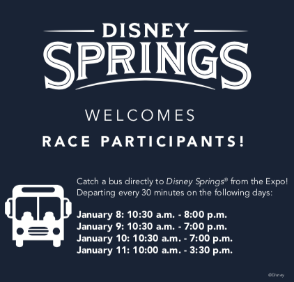 And if you’re looking to catch a bus to Disney Springs to take advantage of the personalized merch or discounts offered for runners, here’s a look at the bus schedule. The bus should depart every 30 minutes and times vary depending on the day.
