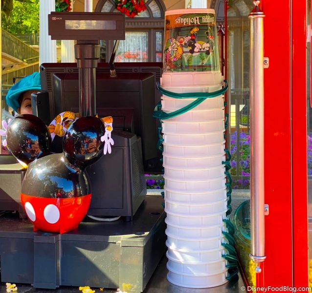 We noticed that Popcorn Carts around the park still had the Mickey and Minnie Happy Holiday Buckets…