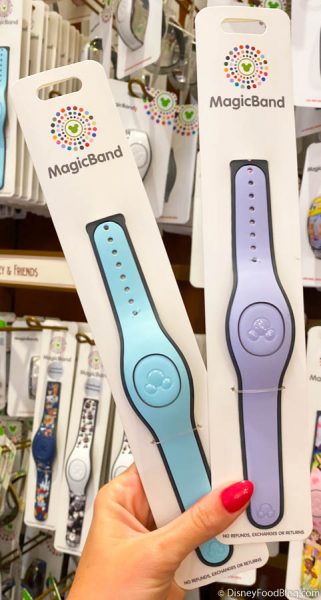 There’s some updated packaging on these $14.99 Solid Color MagicBands in light blue and lavender.