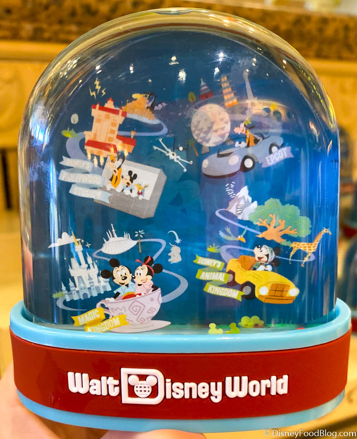 You can also get the same art style representing all four parks in a Snow Globe for $16.99. Plus, when you shake it little Mickey confetti falls!