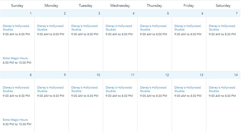 For the rest of the Sundays in the month, Hollywood Studios has an 8:30 PM regular closing time so Extra Magic Hours will be 8:30 PM to 10:30 PM on March 8, 15, 22, and 29.