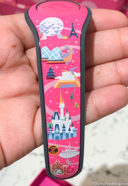 The hot pink band features attractions like Buzz Lightyear’s Space Ranger Spin, Spaceship Earth, Journey Into Imagination.