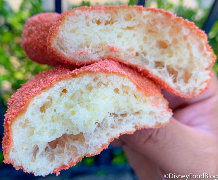 Now be forewarned, we didn’t love this crazy rendition as much as a classic beignet. The red sour candy sugar isn’t nearly as fine as classic beignet sugar and it definitely screws with the texture, so don’t expect this one to be melting in your mouth like a traditional beignet. Plus, it really is SOUR. So if puckering up isn’t your thing, maybe look elsewhere for that beignet fix. But if it is, then this thing is pretty darn good!