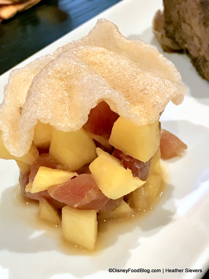 The second fish dish on the plate was Tuna Poke with Avocado Cream and a Prawn Chip. This dish lands you squarely in the islands with a combination of fresh tuna and cubes of mango.