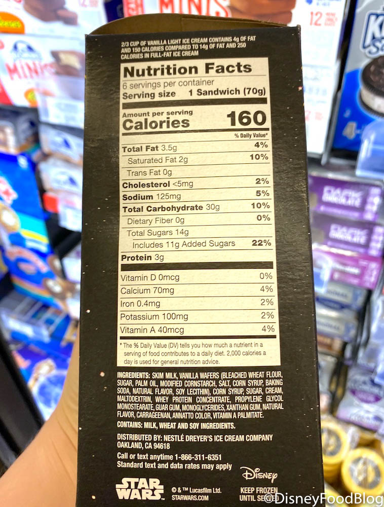 The boxes come with 6 individual ice cream sandwiches made with light ice cream! So, that means they’re a guilt-free treat that’s only 160 calories! (The Force is strong with them.)