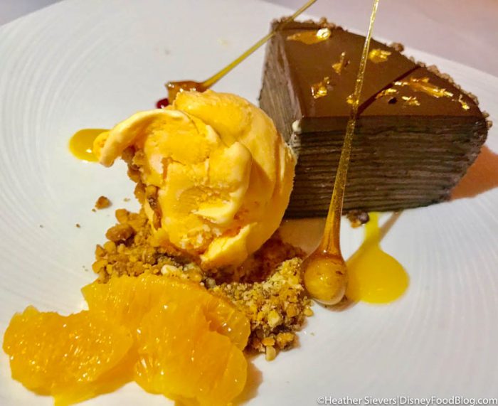 Our favorite of the three desserts was the 28 Layer Chocolate Crepe Cake served with 50/50 bar orange ice cream. This is a new take on Steakhouse 55’s famous chocolate layer cake!