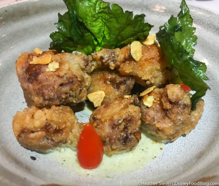 We ordered the Japanese Popcorn Chicken made with shishito pepper aioli, crispy garlic chips, shiso leaf, and togarashi as an appetizer. The chicken had a slight bit of crunch to it but melted with every bite. The shishito pepper aioli gave the appetizer a slight heat that matched the saltiness of the chicken’s breading (and we LOVED it)!