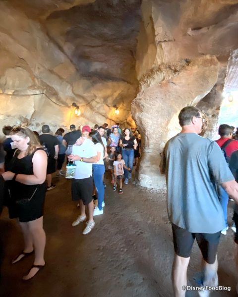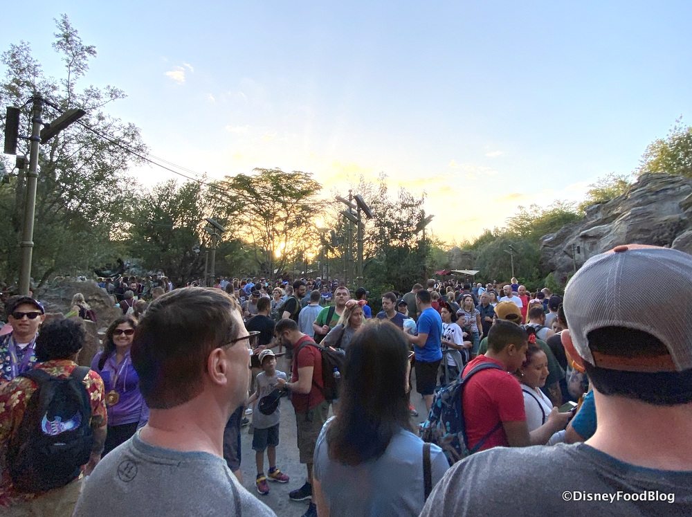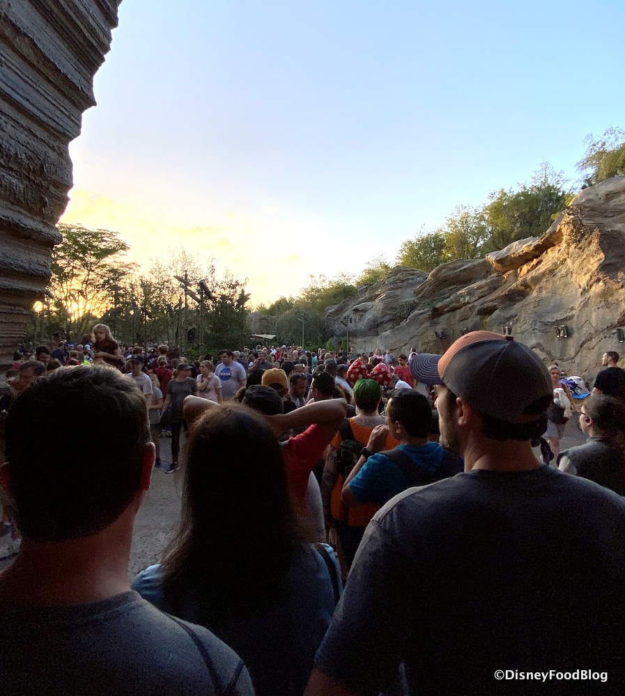 And even though you can only reserve a boarding group once Hollywood Studios is open for the day and you step inside the park, you still gotta get here really early before all the boarding groups are given out. Typically, guests can expect a small bit of line time, especially if things are running smoothly. But this evening, we were thwarted by a sea of people still waiting to ride the attraction even after their boarding groups were called! The line stretched all the way beyond the entrance to Galaxy’s Edge!
