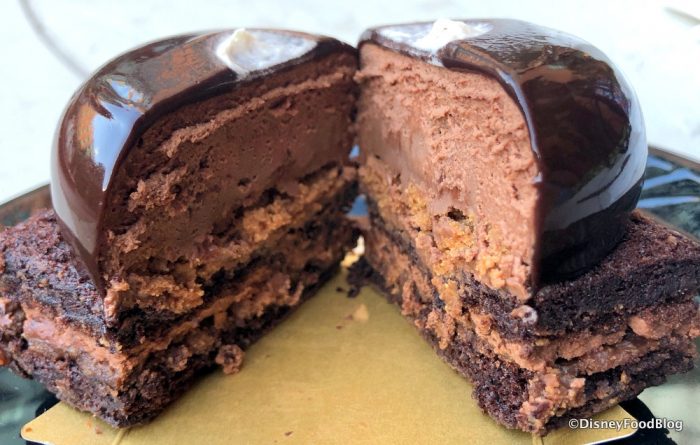 Taking a few bites, we can tell ya the chocolate “stone” is suuuper chocolate-y. The chocolate flavor is really dark, so this dessert is great for folks who don’t like really sweet treats. The crunchy toffee layer at the bottom adds some contrast to the textures of the soft, silky mousse and brownie-like consistency of the cake.
