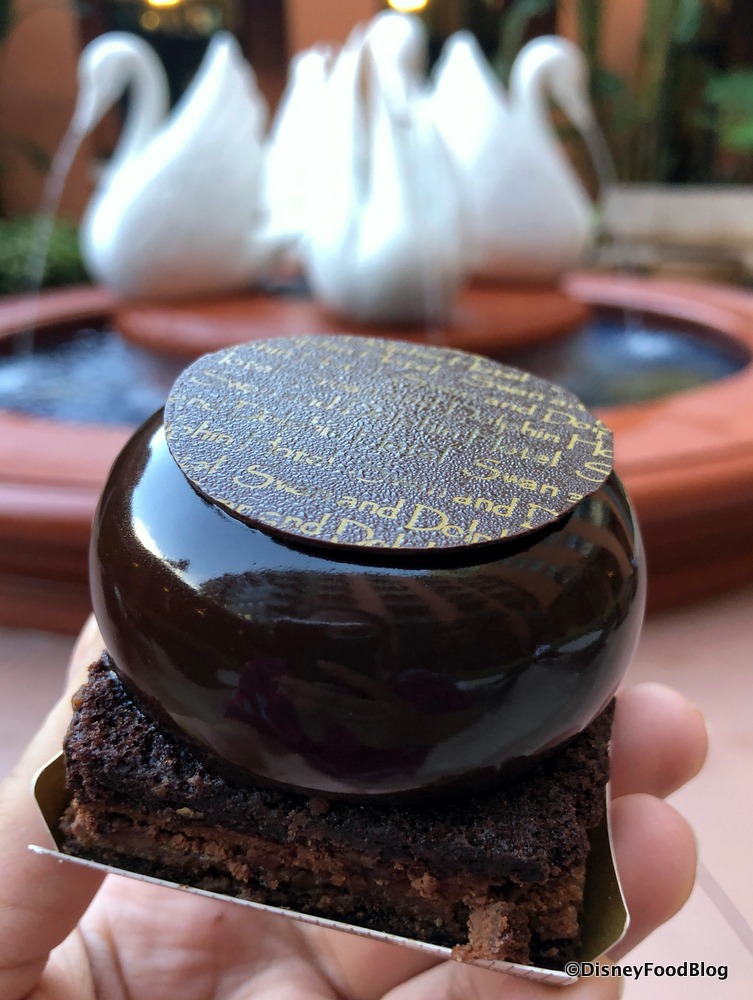 We love the sleek look and refined style of this classy dessert! “Swan and Dolphin Hotel” appears repeated all over the decorative chocolate topper for just a little extra panache!