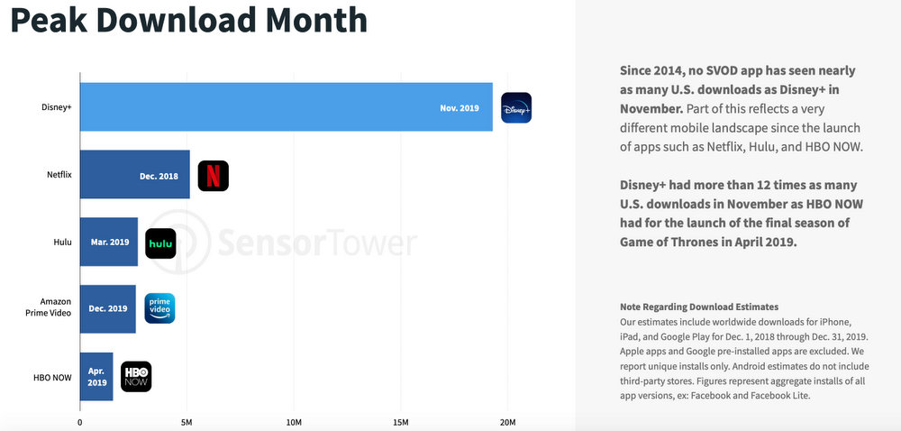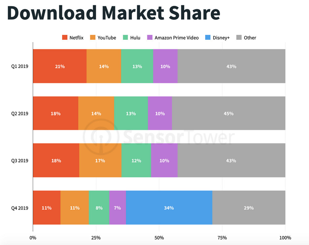 So, are other live-streaming platforms being affected by Disney+’s success? According to this chart compiled by Sensor Tower, it appears so. Netflix seems to be taking the biggest loss, but competitors across the board seem to be losing download market share.