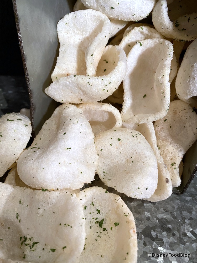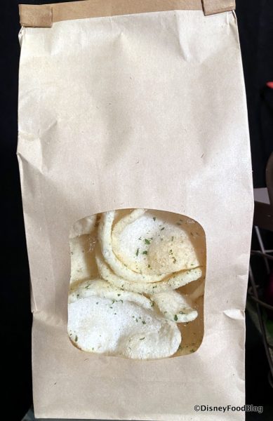 At the various drink carts located throughout Batuu, you’ll be able to get your hands on the new Galma Garlic Cheese Puff Chips! They come already pre-packaged in a brown paper bag with a little peek-a-boo window to see inside!