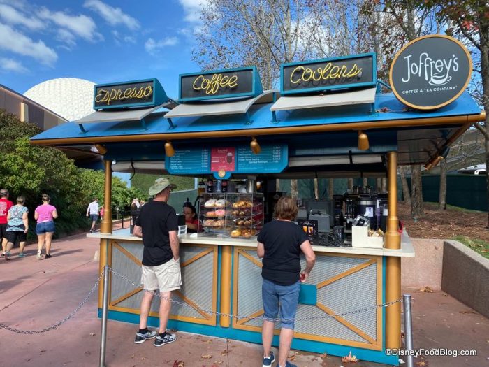 Joffrey’s Coffee & Tea Company is a great place to stop for a caffeine boost on busy park days, so we were psyched to check out their Festival of the Arts-exclusive drinks — all paired with their own delicious pastry! There are four unique offerings across the park, each available at a different Joffrey’s location! And don’t worry, you can get any of these coffee drinks served hot or iced! Each one of ’em costs $9.50, no matter which one you get!