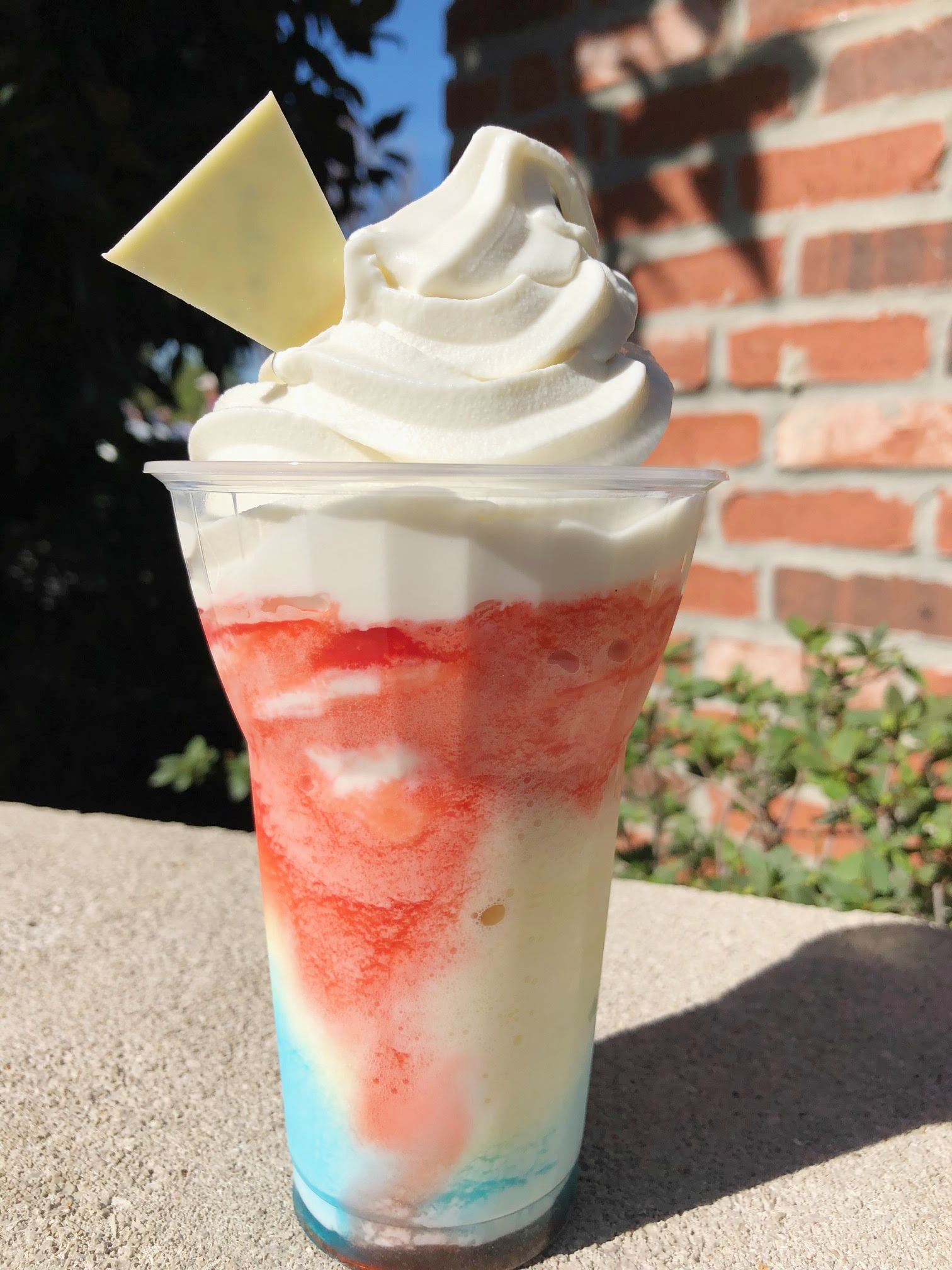 The very patriotic slush is swirled up with Strawberry, Lemonade, and Blue Raspberry Slushy flavors AND Vanilla Ice Cream with White Chocolate!