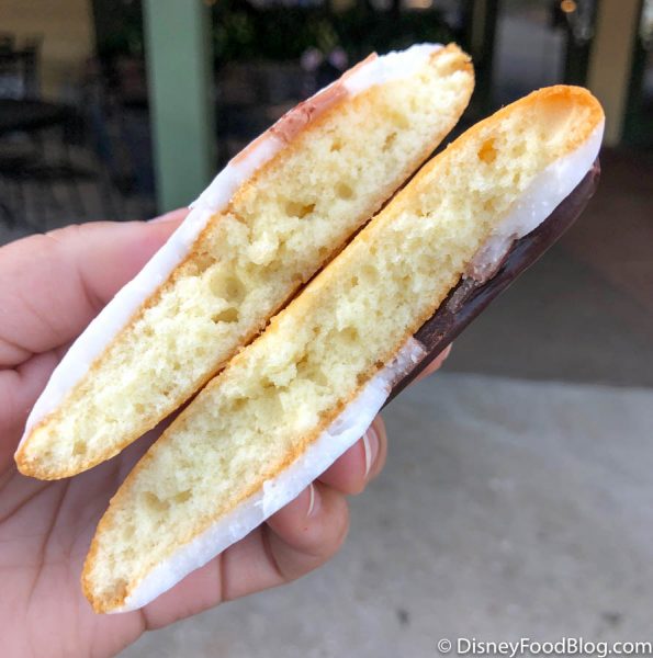 This was delicious, and definitely the standout of the two for us! The cookie was super-soft, without being crumbly. It tasted incredibly fresh, and paired well with the royal icing (which was also very yummy). The chocolate icing tasted a bit like the icing they use on chocolate-frosted donuts, and might have been one of our favorite parts of the whole treat!