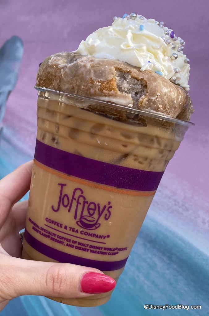 We thought the new Joffrey’s coffee and donut duos themed after different artist movements at this year’s Festival of the Arts were a great addition. And our stand-alone favorite was the Impressionism Pairing over in the Canada pavilion’s Joffrey’s. It features a blackberry iced latte that comes topped with a blueberry donut and whipped cream! So yummy! You can pick this awesome treat up for $9.50!