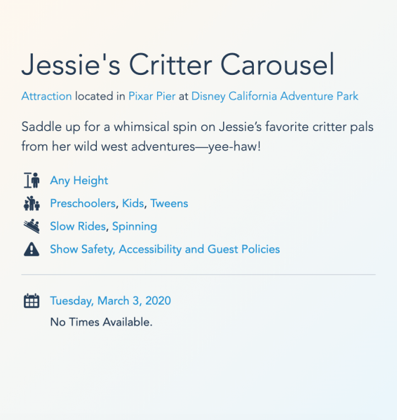 Jessie’s Critter Carousel, which opened less than one year ago in April of 2019, is possibly undergoing a brief refurbishment in late February. On Disneyland’s website, we noticed that there are currently no operating times reported for February 24, 2020.