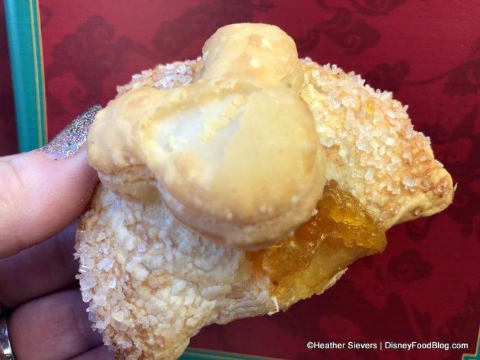 We’re obsessed with this flaky, sweet Mango-Pineapple Pastry which is layers of wonderful crust filled with pineapple jelly and diced mango! It’s a nice, sweet contrast to the Mickey Chinese Hot Dog Bun, plus it comes topped with a Mickey-shaped piece of pastry!