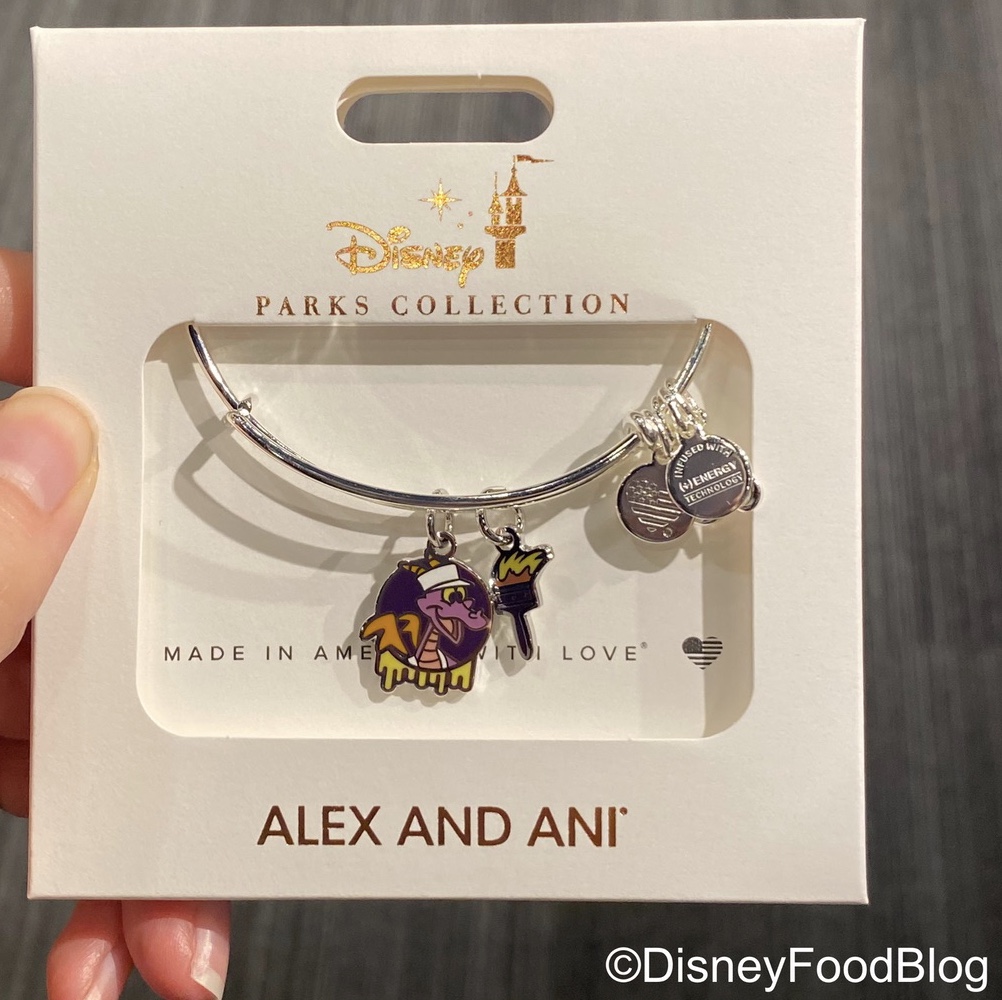 We found some new goodies over at the temporary Mouse Gear location. The Festival of the Arts Figment merch keeps on coming — and that is a GOOD thing! We spotted his latest venture — himself with a paintbrush on an Alex and Ani bracelet for $49.99. We are OBSESSED!