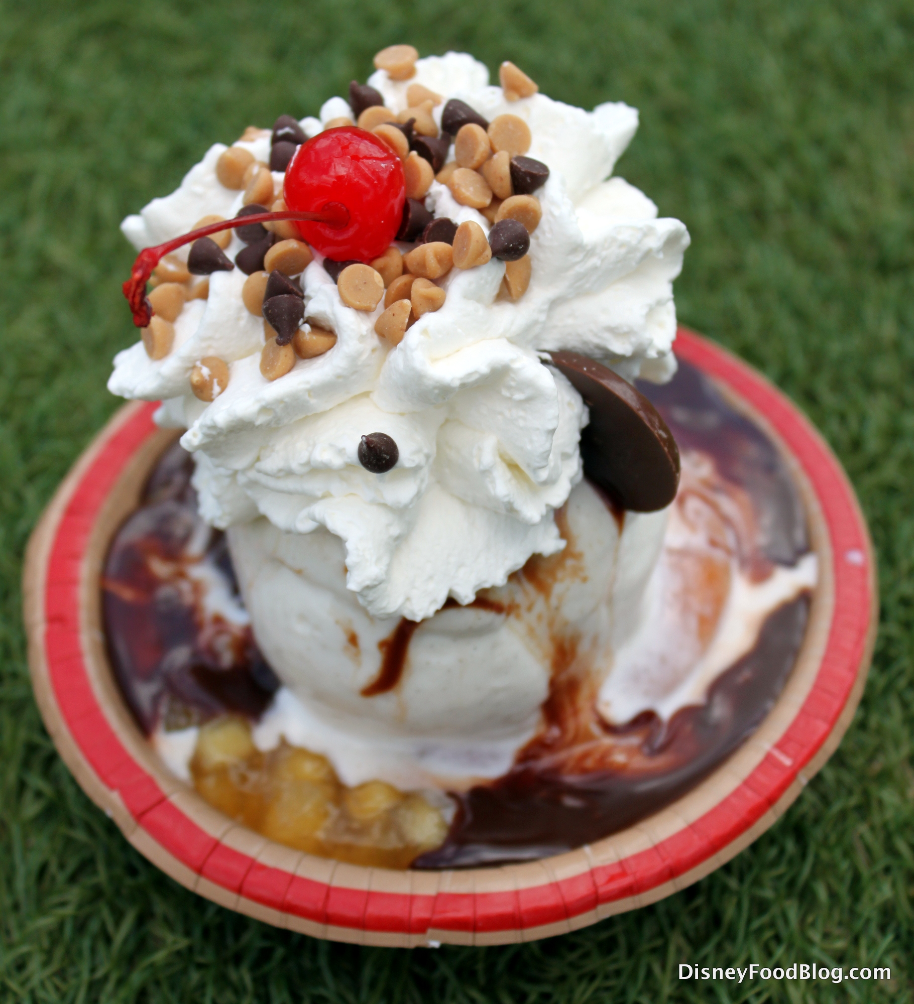 If you’re craving sweets, there are very few places serving up a better value for your DDP snack credit than Magic Kingdom’s Plaza Ice Cream Parlor! This place has monster-size Specialty Sundaes — most of which you can get for just one snack credit (sorry, not the Mickey’s Kitchen Sink Sundaes, but pretty much anything with two scoops or less is fair game! ;-D).