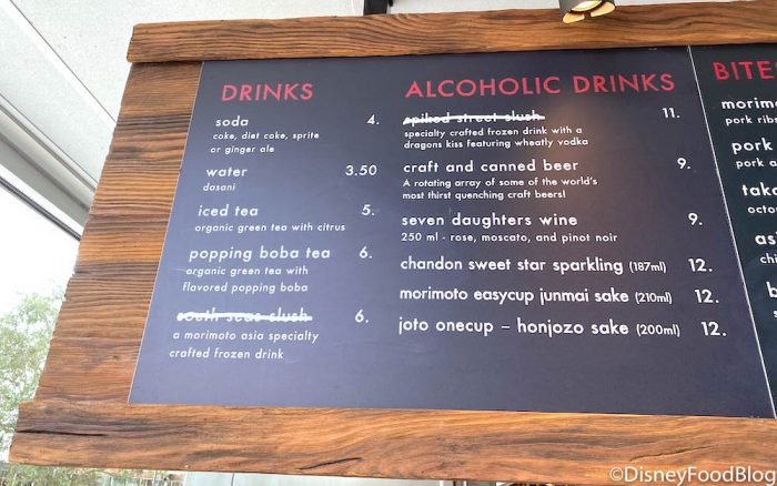 Morimoto Asia Street Food must have been dishing out plenty of goodies recently ’cause they were out of a lot of different items when we stopped by! Although we aren’t sure when they’ll be restocked, a few items were unavailable like the South Seas Slush, Spiked Street Slush…